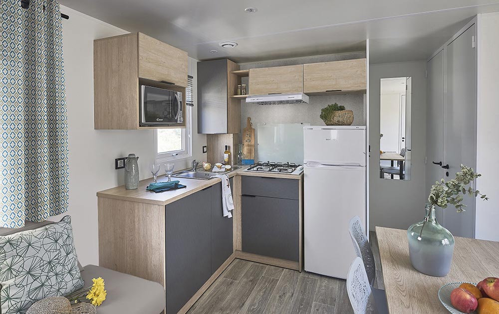 – Une kitchenette entièrement équipée (vaisselle et ustensiles) avec plaque de cuisson, réfrigérateur, micro-ondes, évier, hotte aspirante, cafetière, bouilloire électrique, lave-vaisselle.