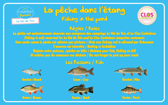 Labellisé « Accueil Pêche » depuis 2025, le Camping Le Clos Cacheleux met à votre disposition un chalet pêche avec frigo pour appâts et documentation dédiée.