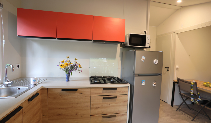 – A fully equipped small kitchen space (dishes + utensils) with a 4 gas hob as well as a microwave, a sink, a fridge, but also an extractor hood, a coffee maker and a kettle.